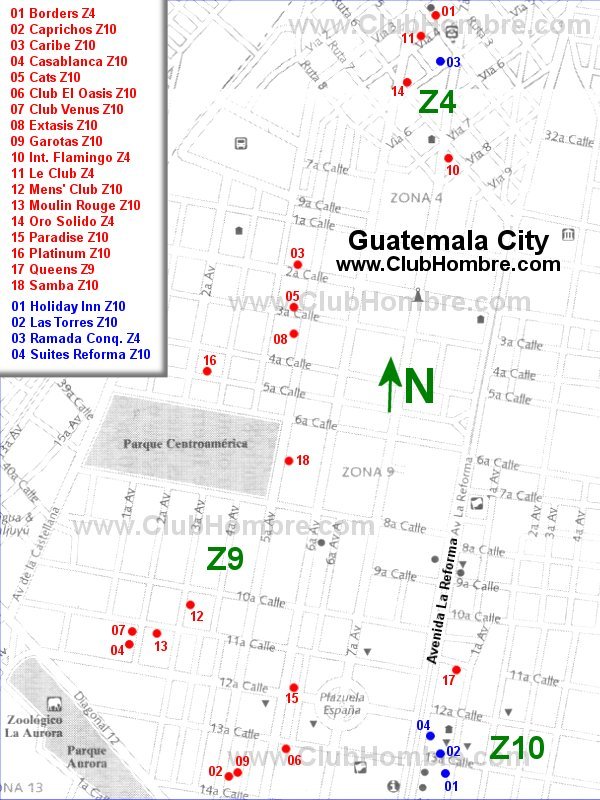 Map Contents: Borders, Caprichos, Caribe, Casablanca, Cats, Club El Oasis, Club Venus, Extasis, Garotas, International Flamingo, Le Club, Men's Club, Moulin Rouge, Oro Solido, Paradise, Platinum, Queens, Samba, Holiday Inn, Las Torres, Ramada Conquistador, Suites Reforma
